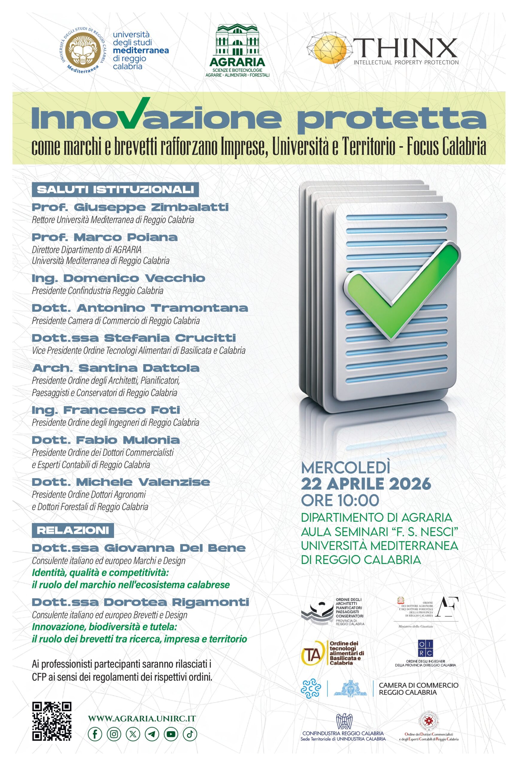 Mercoledì 22 Aprile 2026 dalle ore 10:00 IN PRESENZA presso l’Aula “Francesco Saverio Nesci” del Dipartimento di Agraria dell’Università degli Studi Mediterranea di Reggio Calabria